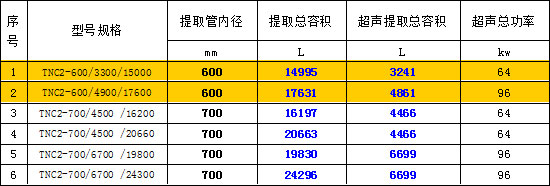 標(biāo)記示例:TNC2-700/3000/6000型,表示提取管直徑700mm,超聲提取管容積3000L,提取管總?cè)莘e6000L的雙級連續(xù)逆流超聲提取機。